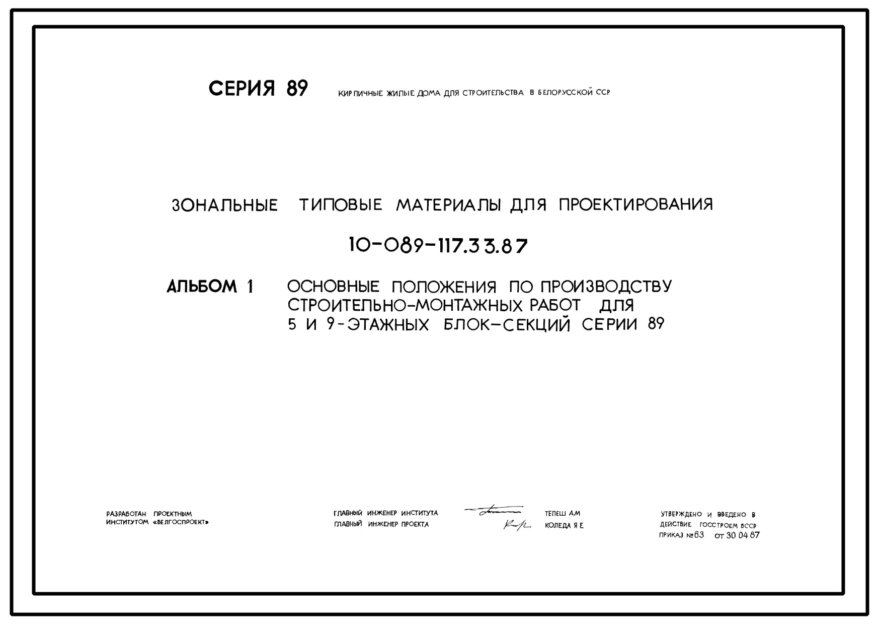 Типовой проект 10-089-117.33.87 Основные положения по производству строительно-монтажных работ для 5 и 9-этажных блок-секций серии 89 (для строительства в Белорусской ССР)