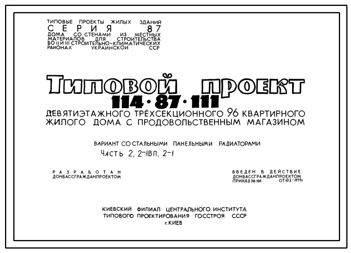 Типовой проект 114-87-111 Девятиэтажный трехсекционный дом с продовольственным магазином на 96 квартир (двухкомнатных 2Б-48; трехкомнатных 3А-24; трехкомнатных3Б-24) со стенами из кирпича. Для строительства во 2В, 3Б и 3В климатический подрайонах Украинск