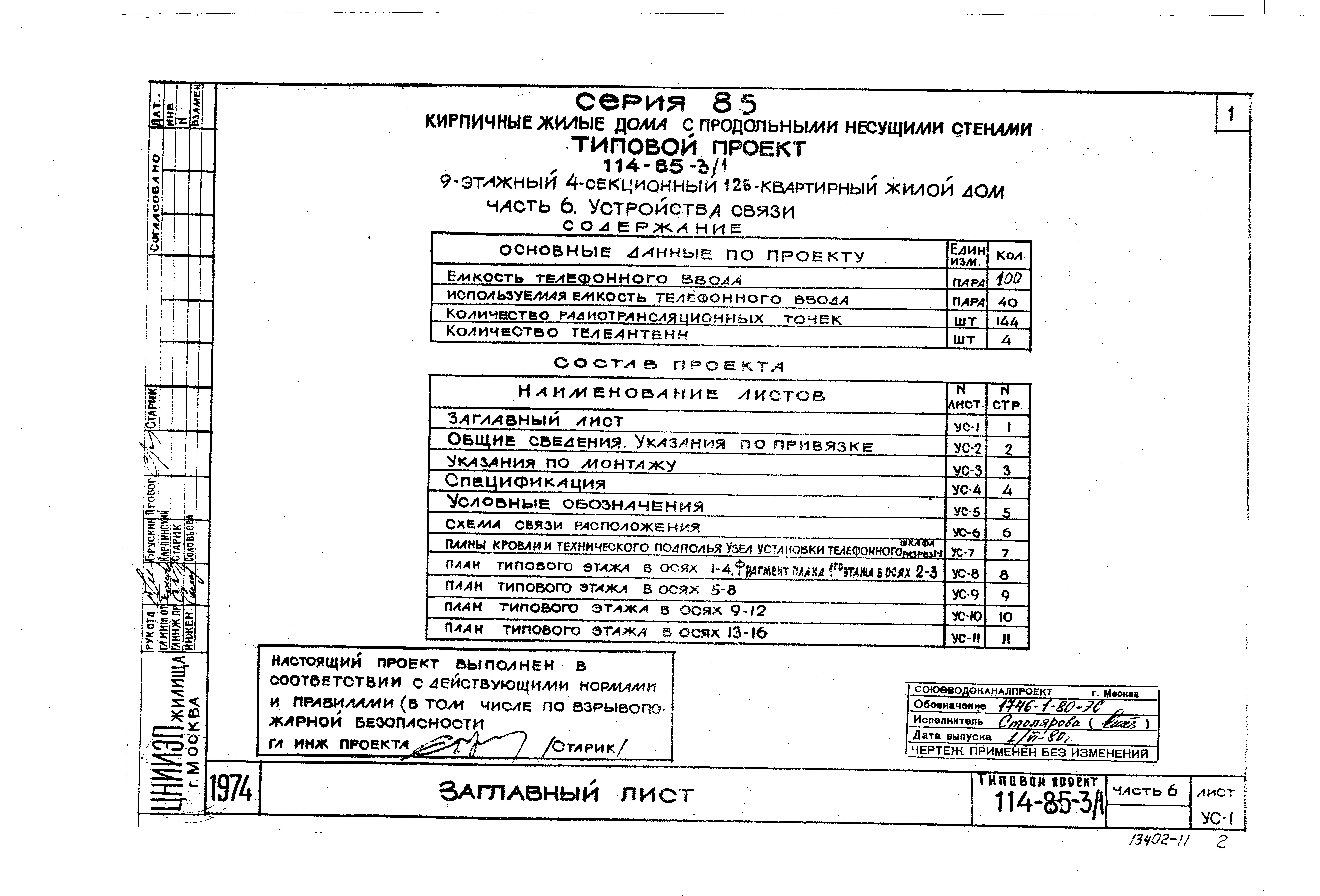 Типовой проект 114-85-3/1 Девятиэтажный четырехсекционный жилой дом на 126 квартир (двухкомнатных 2Б-54; трехкомнатных 3Б-54; четырехкомнатных 4Б-18). Для строительства в 1В климатическом подрайоне 2 и 3 климатических районах