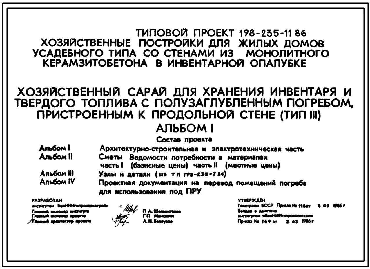 Типовой проект 198-235-11.86 Хозяйственный сарай для хранения инвентаря и твердого топлива с заглубленным погребом, пристроенным к продольной стене. Для индивидуального строительства в сельской местности