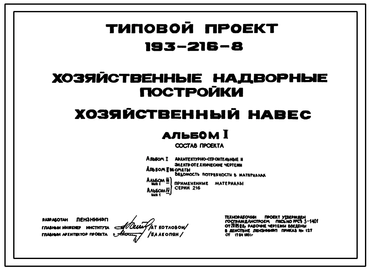 Типовой проект 193-216-8 Хозяйственные надворные постройки. Хозяйственный навес.