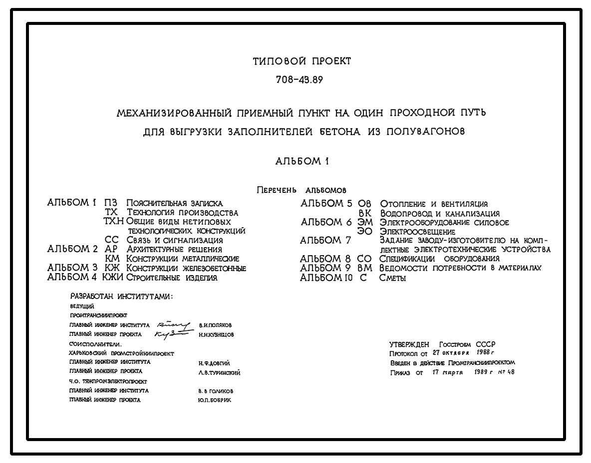 Типовой проект 708-43.89 Механизированный приемный пункт на один проходной путь для выгрузки заполнителей бетона из полувагонов