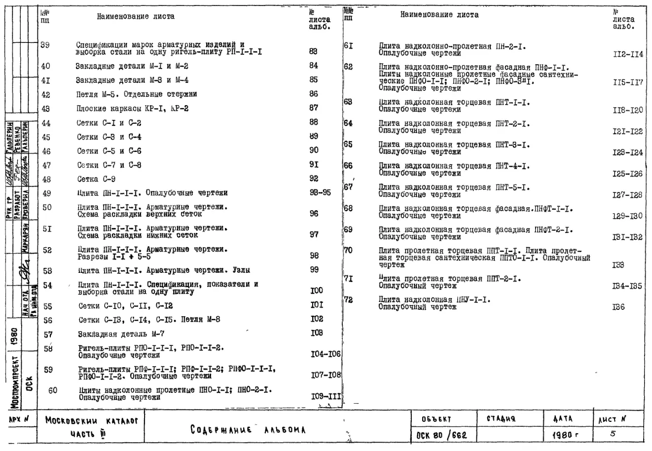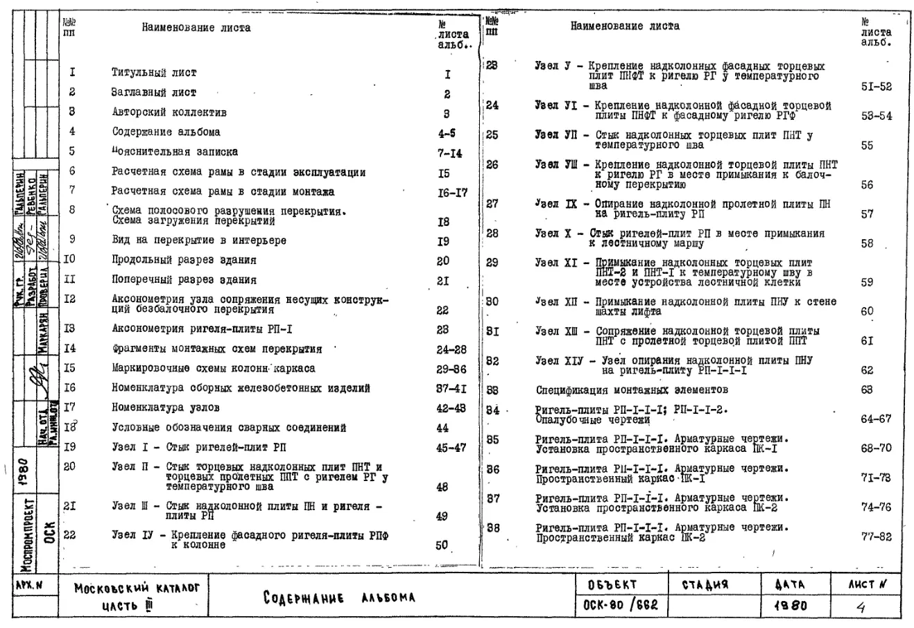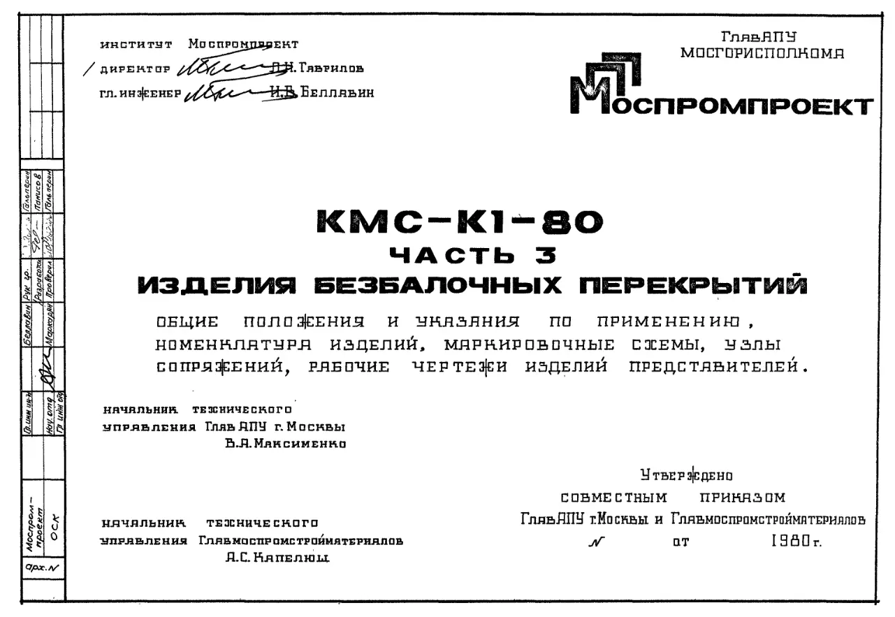 Шифр КМС-К1-80 Изделия безбалочных перекрытий .Общие положения и указания по применению, номенклатура изделий, узлы сопряжений, рабочие чертежи изделий.