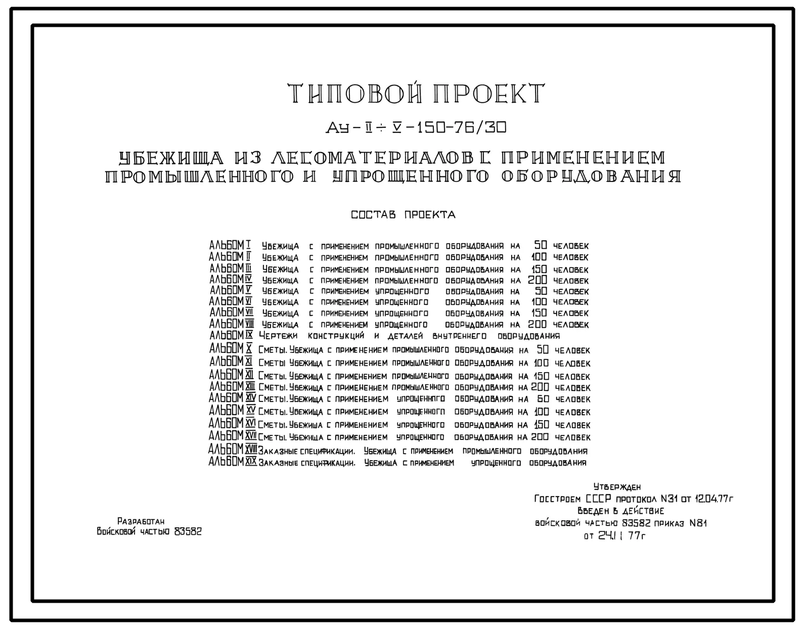 Типовой проект Ау-II,III,IV,V-150-76/30 Быстровозводимое убежище на 150 человек с применением промышленного и упрощенного оборудования. Стены из лесоматериалов (убежище на 150 человек, размеры убежища 23,4м на 3,6м, режимы вентиляции 1,2)