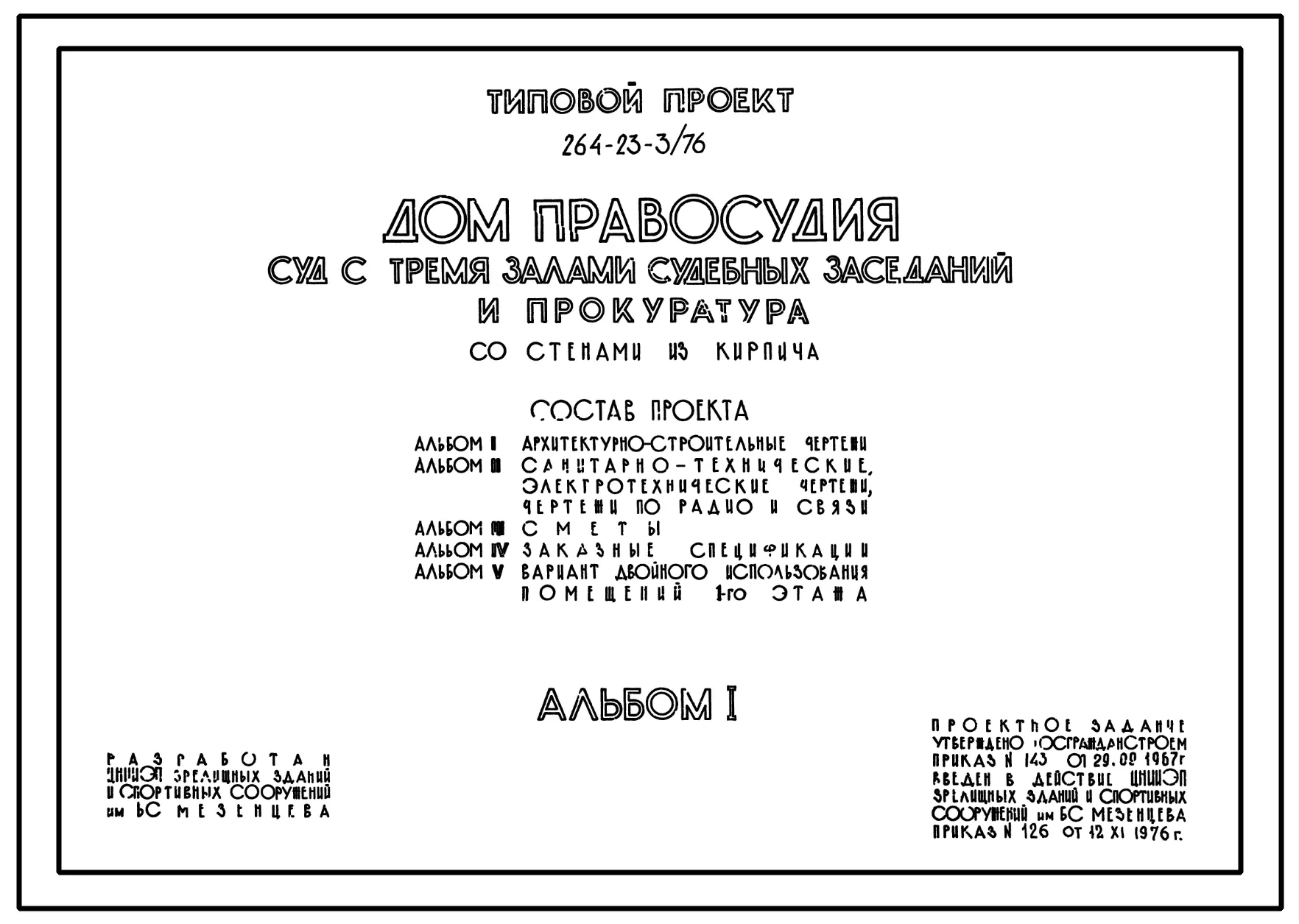 Типовой проект 264-23-3/76 Дом правосудия — суд с тремя залами судебных заседаний и прокуратура, со стенами из кирпича. Для строительства в IВ климатическом подрайоне, II и III климатических районах.
