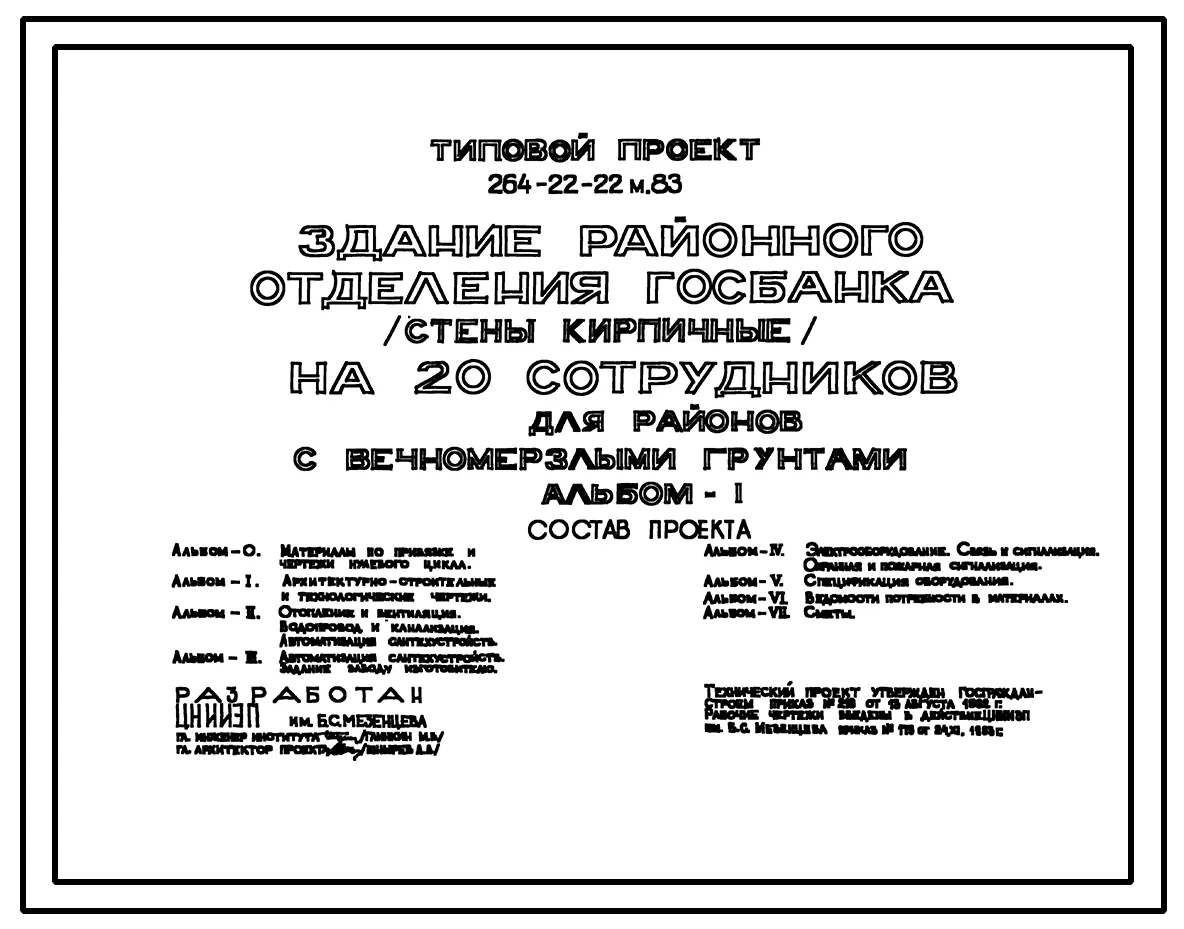 Типовой проект 264-22-22м.83 Здание районного отделения госбанка (стены кирпичные) на 20 сотрудников. Для строительства в 1А,1Б и 1Г климатических подрайонах на вечномерзлых грунтах, используемых по принципу 1.