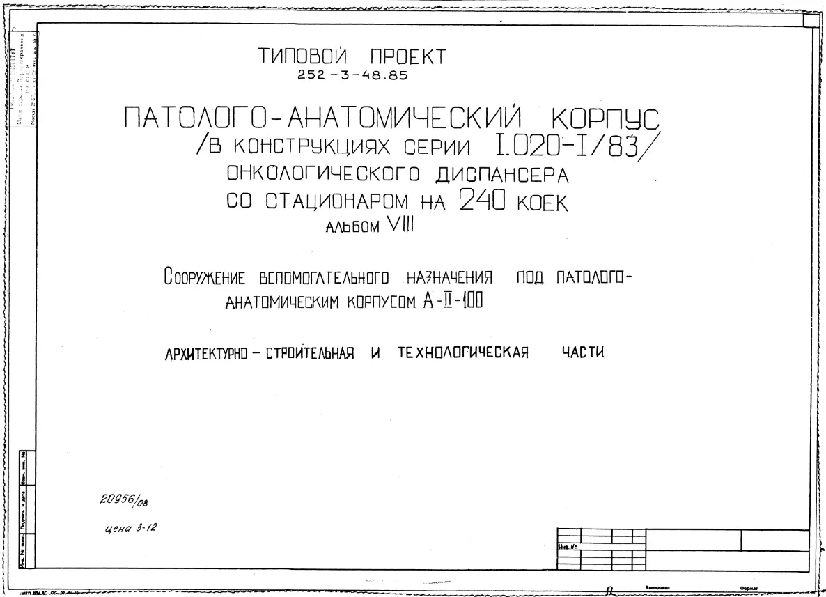 Типовой проект A-II-100 252-3-48.85 Сооружение вспомогательного назначения под патологоанатомическим корпусом онкологического диспансера со стационаром на 240 коек. Конструкции железобетонные сборно-монолитные по серии У-01-01/80 (для сух