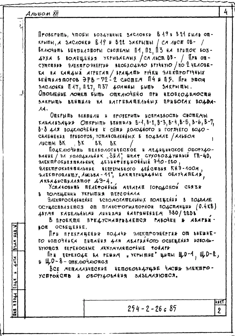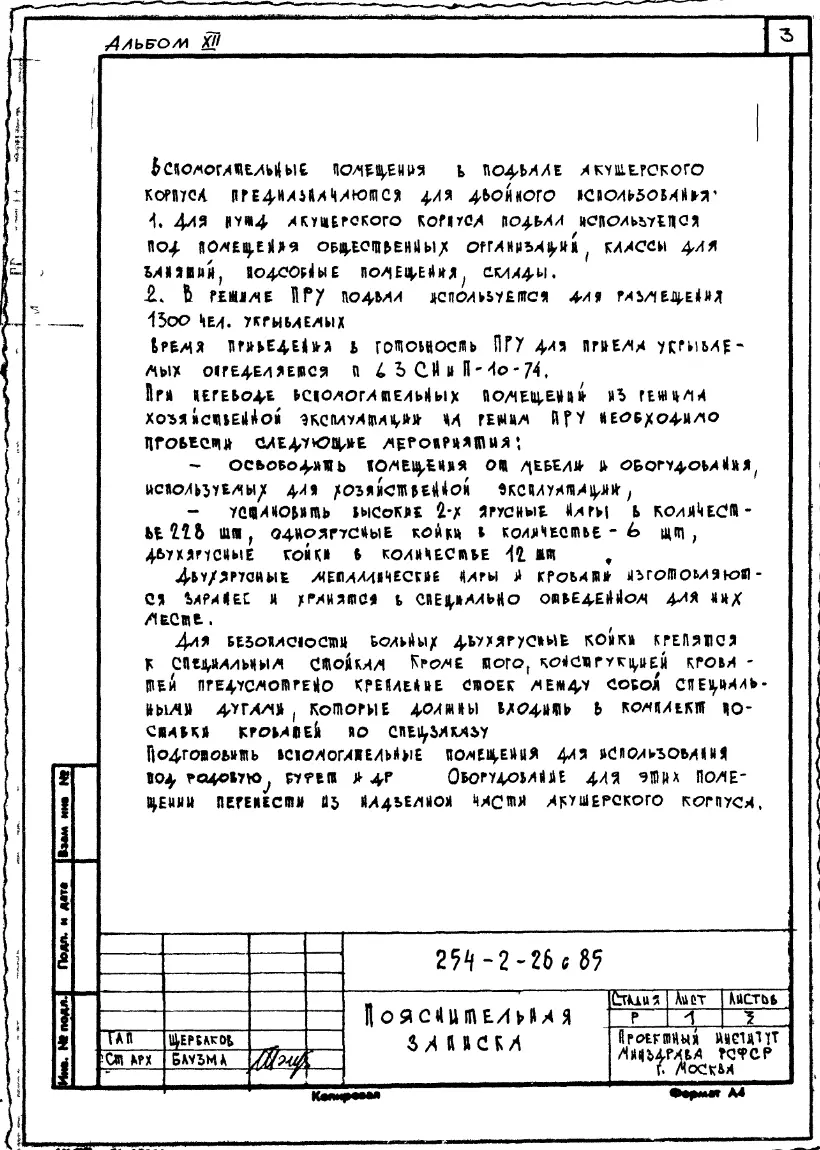 Типовой проект П-4-1185(254-2-26с.85) Вспомогательные помещения в подвале акушерского с стенами из кирпича на 30 коек для существующих ЦРБ, (убежище на 1185 человек, размеры убежища 78,95м на 34,2м, режимы вентиляции 1,2).. Чертежи (формат TIF) Паспорт проекта