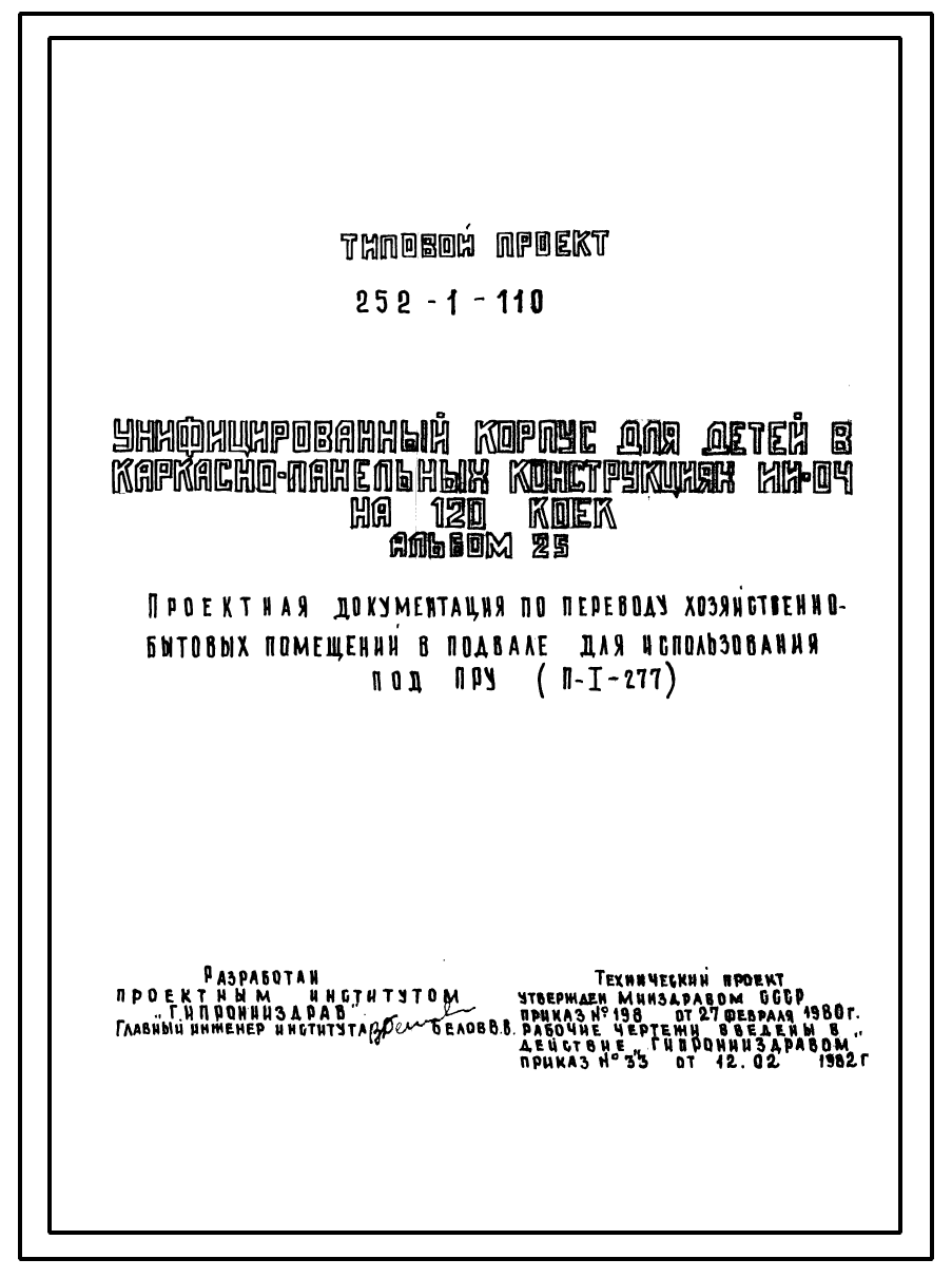 Типовой проект П-1-277(252-1-110) Хозяйственно-бытовые помещения в подвале унифицированного корпуса для детей (в каркасно-панельных конструкциях ИИ-04) на 120 коек, (убежище на 277 человек, размеры убежища 64,16м на 60м, режимы вентиляции 1,2).