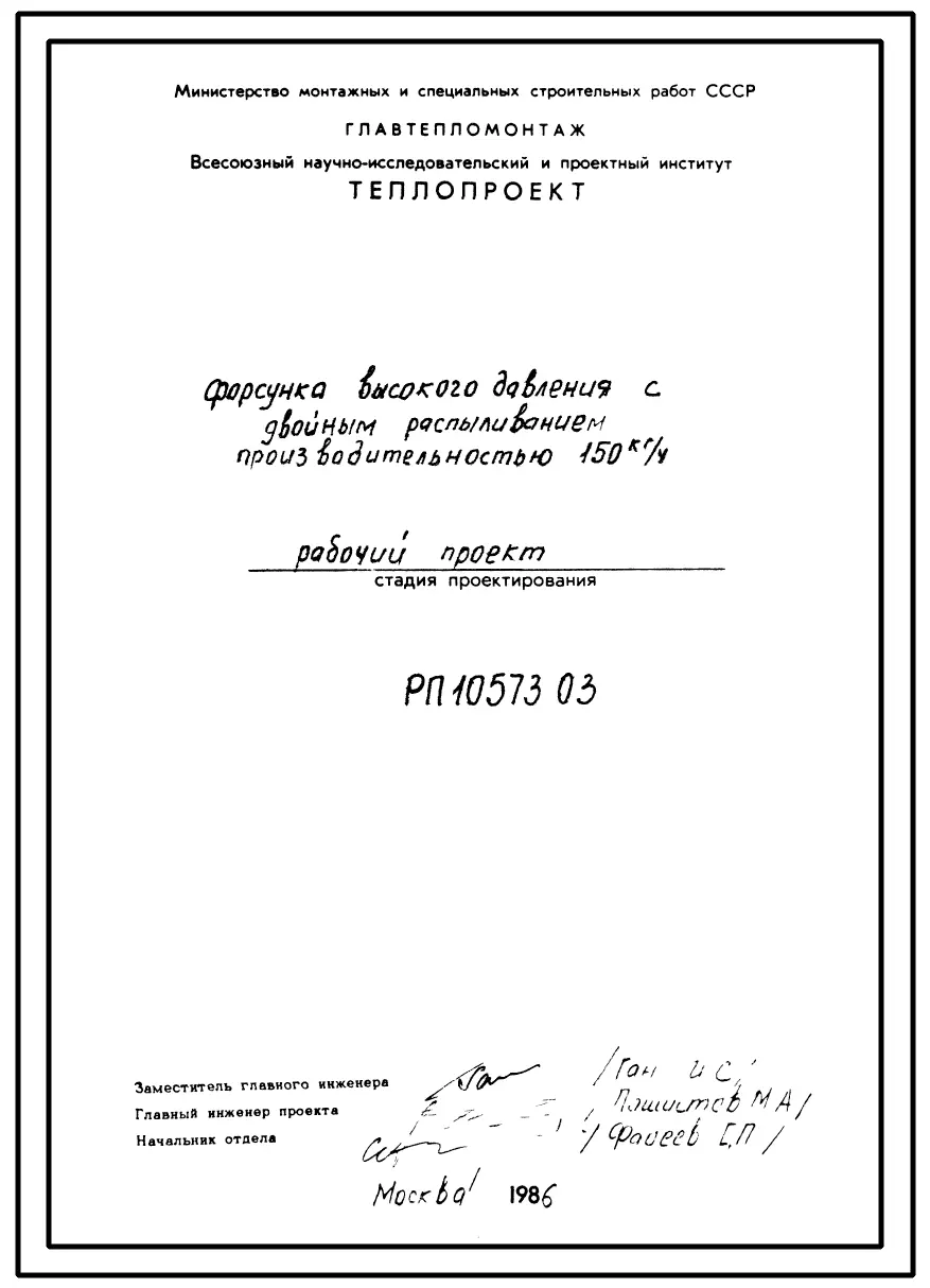 Проект РП10573.03 Форсунка высокого давления для мазута с двойным распыливанием производительностью Qном= 150 кг/час