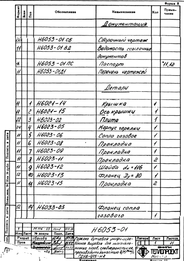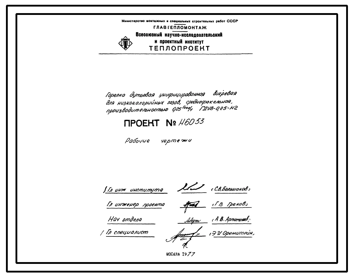 Проект Н6053 Горелка дутьевая унифицированная вихревая для низкокалорийных газов , среднефакельная , производительностью 0,25 Гкал/ч ГДУВ-0,25-Н2