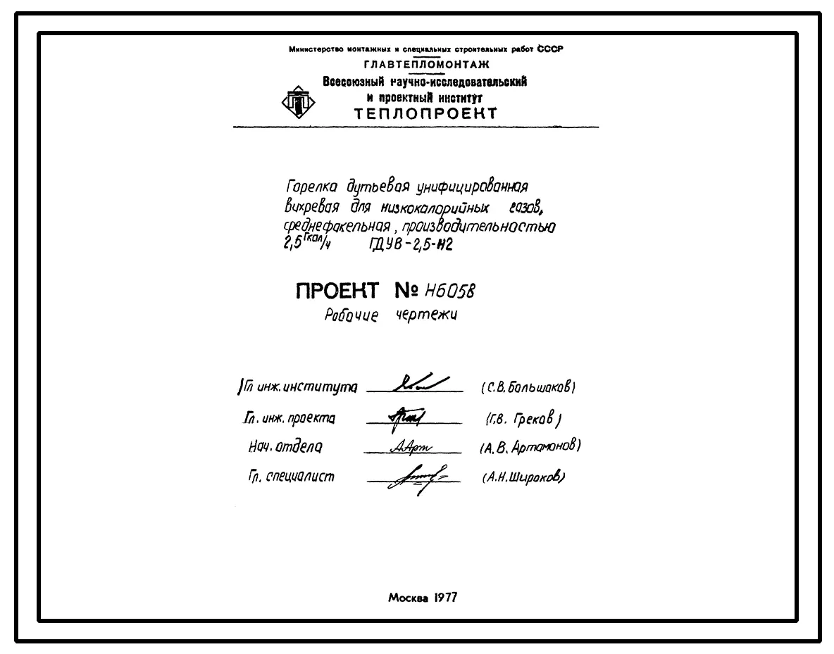 Проект Н6058 Горелка дутьевая унифицированная вихревая для низкокалорийных газов , среднефакельная , производительностью 2,5 Гкал/ч ГДУВ-2,5-Н2