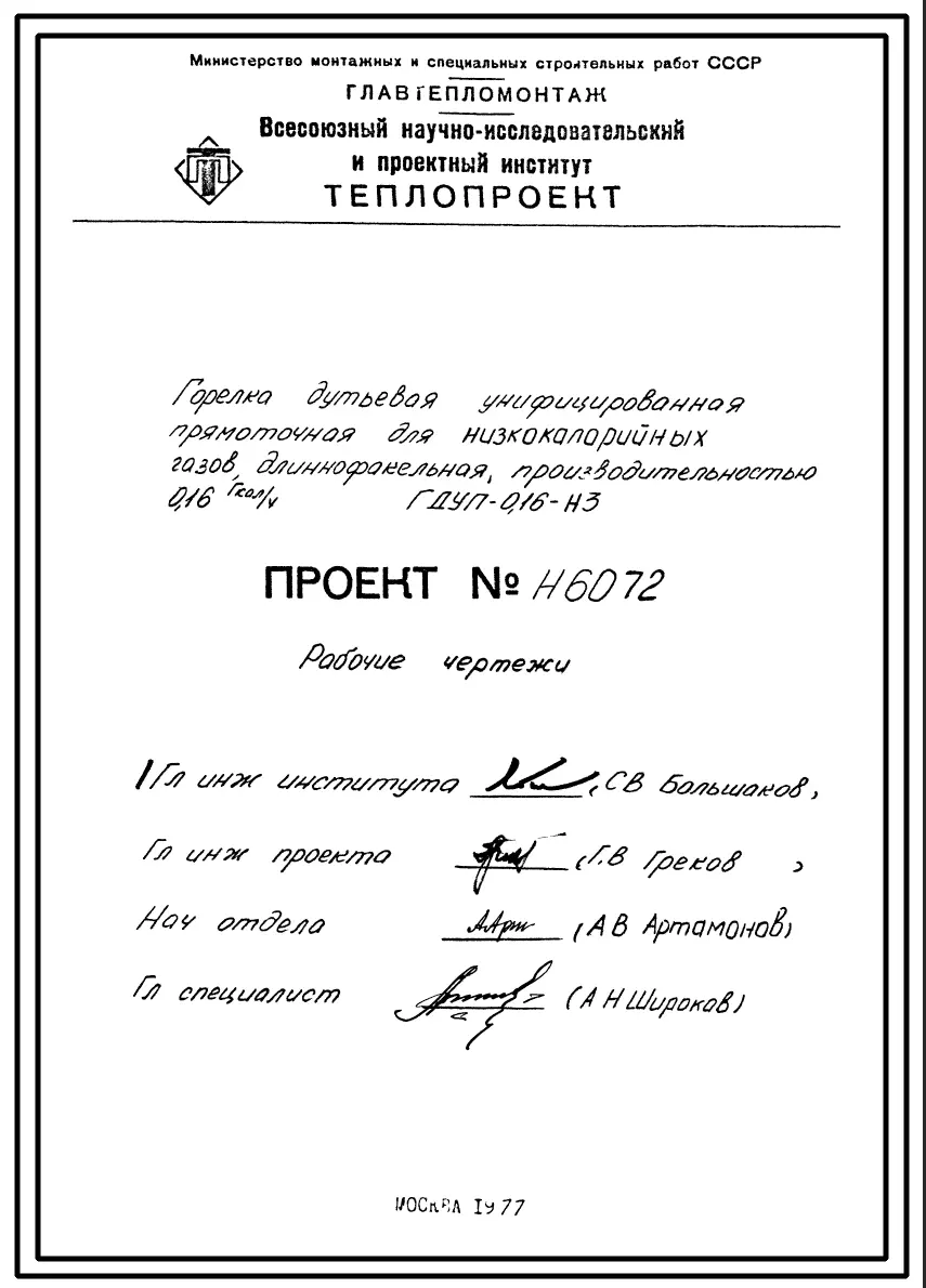 Проект Н6072 Горелка дутьевая унифицированная прямоточная для низкокалорийных газов , длиннофакельная , производительностью 0,16 Гкал/ч ГДУП-0,16-Н3