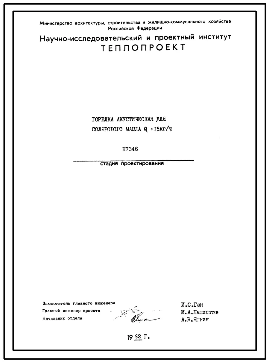 Проект Н7346 Горелка акустическая для солярового масла Q=15 кг/час