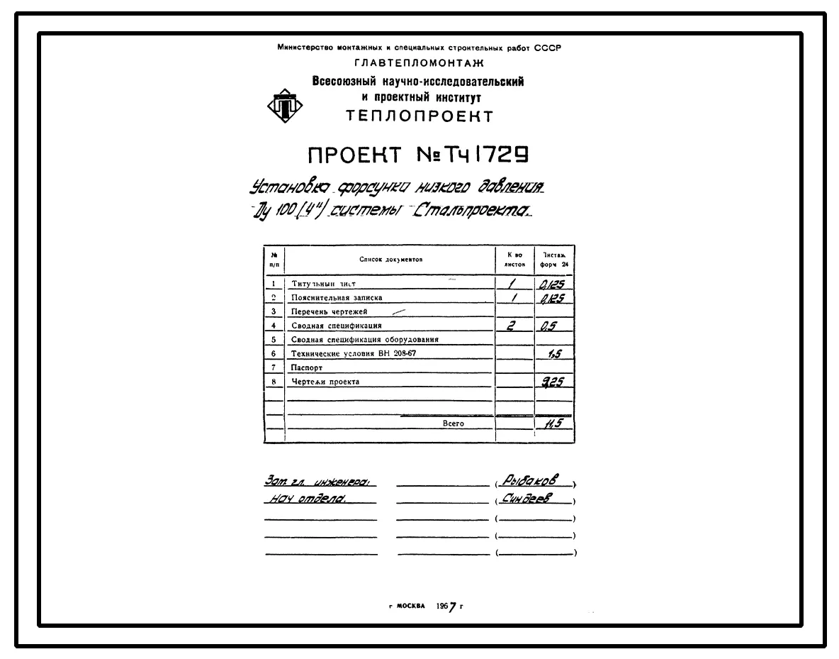 Проект Тч1729 Установка форсунки низкого давления Ду 100 системы Стальпроекта