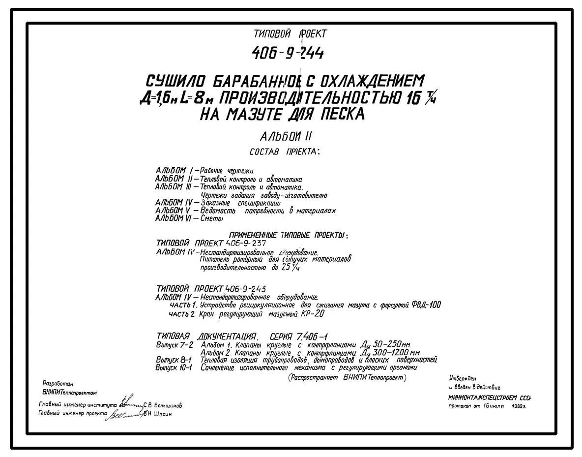 Типовой проект 406-9-244 Сушило барабанное с охлаждением Д=1,6 м, L=8 м производительностью 16 т/ч на мазуте для песка