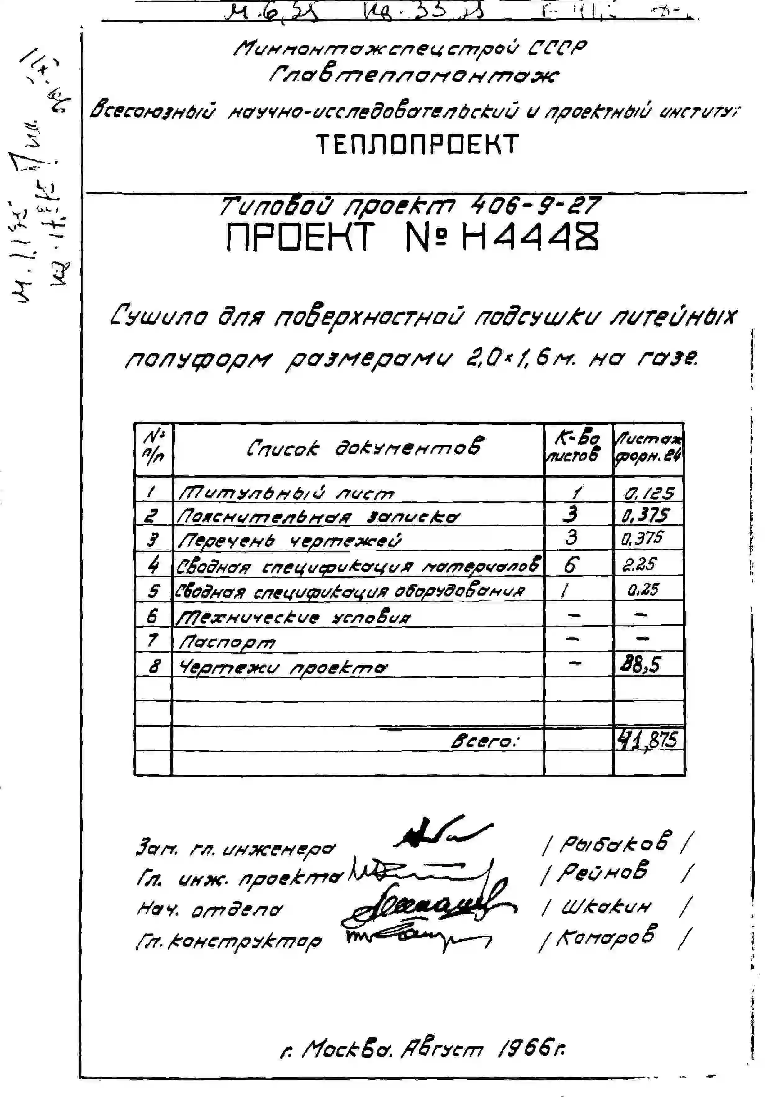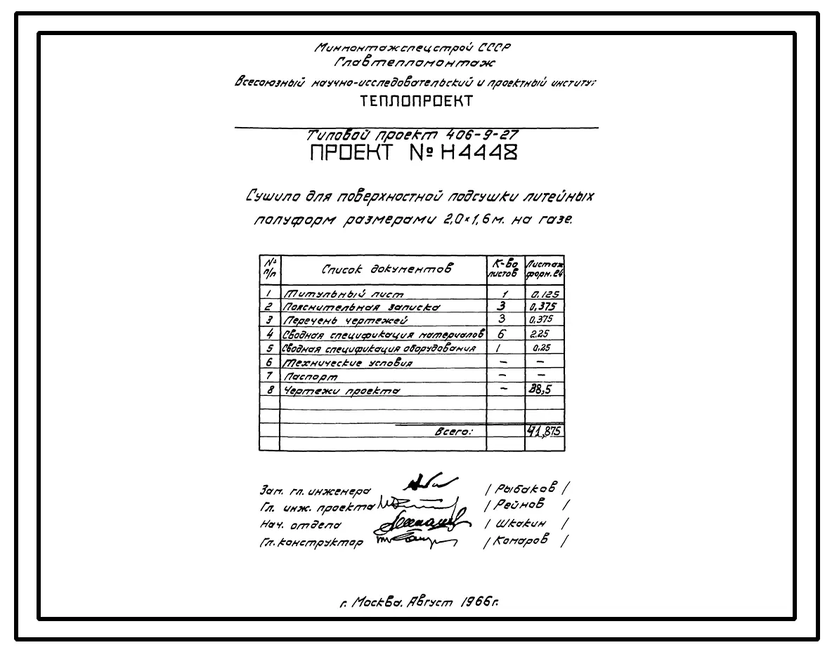 Типовой проект 406-9-27 Сушило для поверхностной подсушки литейных полуформ размерами 2,0х1,6 м на газе