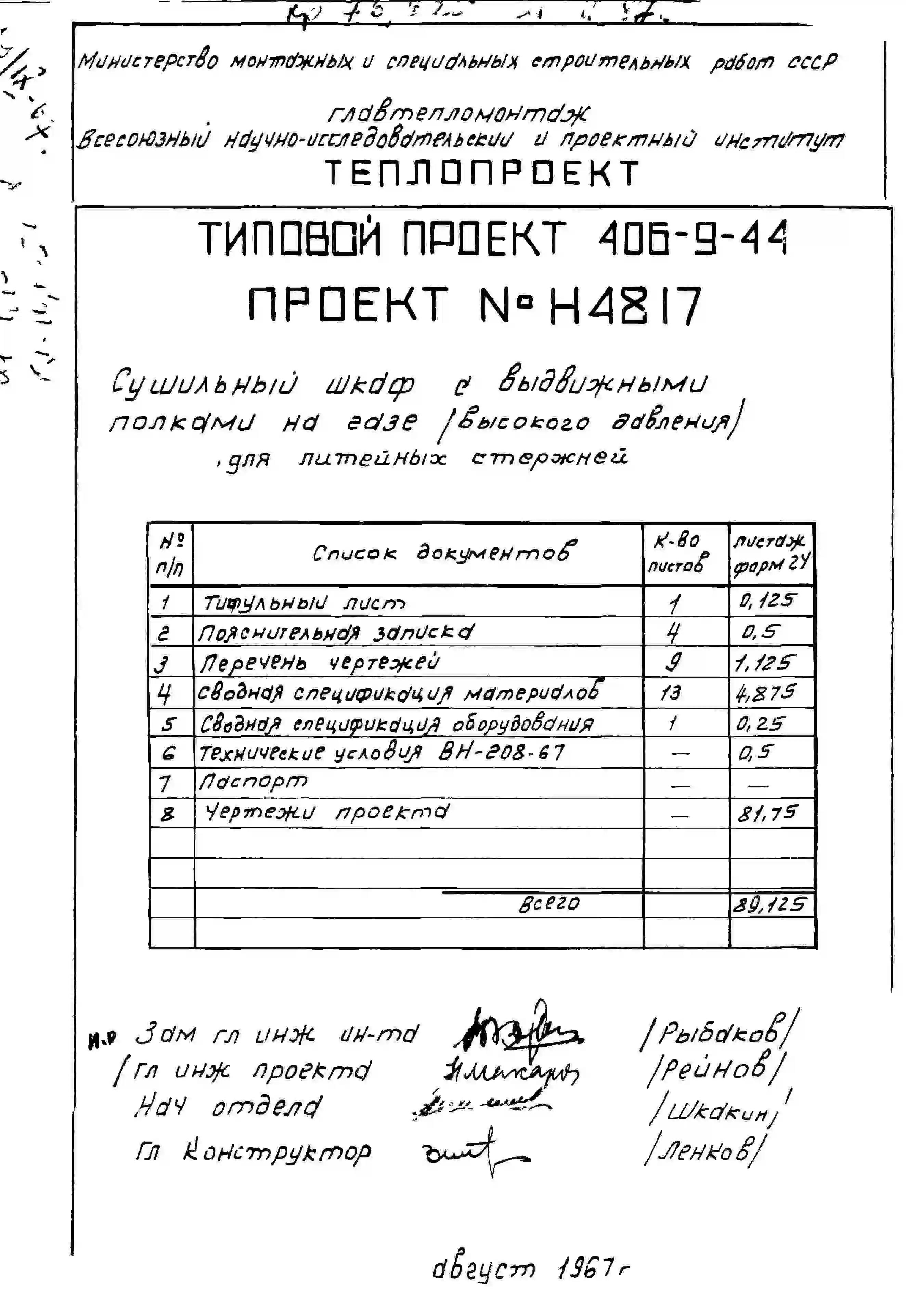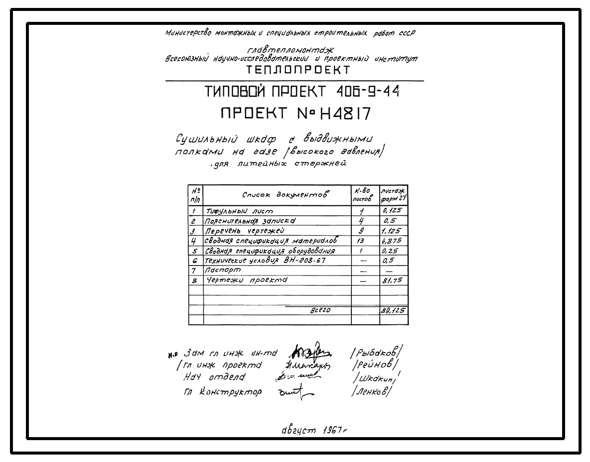Типовой проект 406-9-44 Сушильный шкаф с выдвижными полками на газе и мазуте для сушки стержней