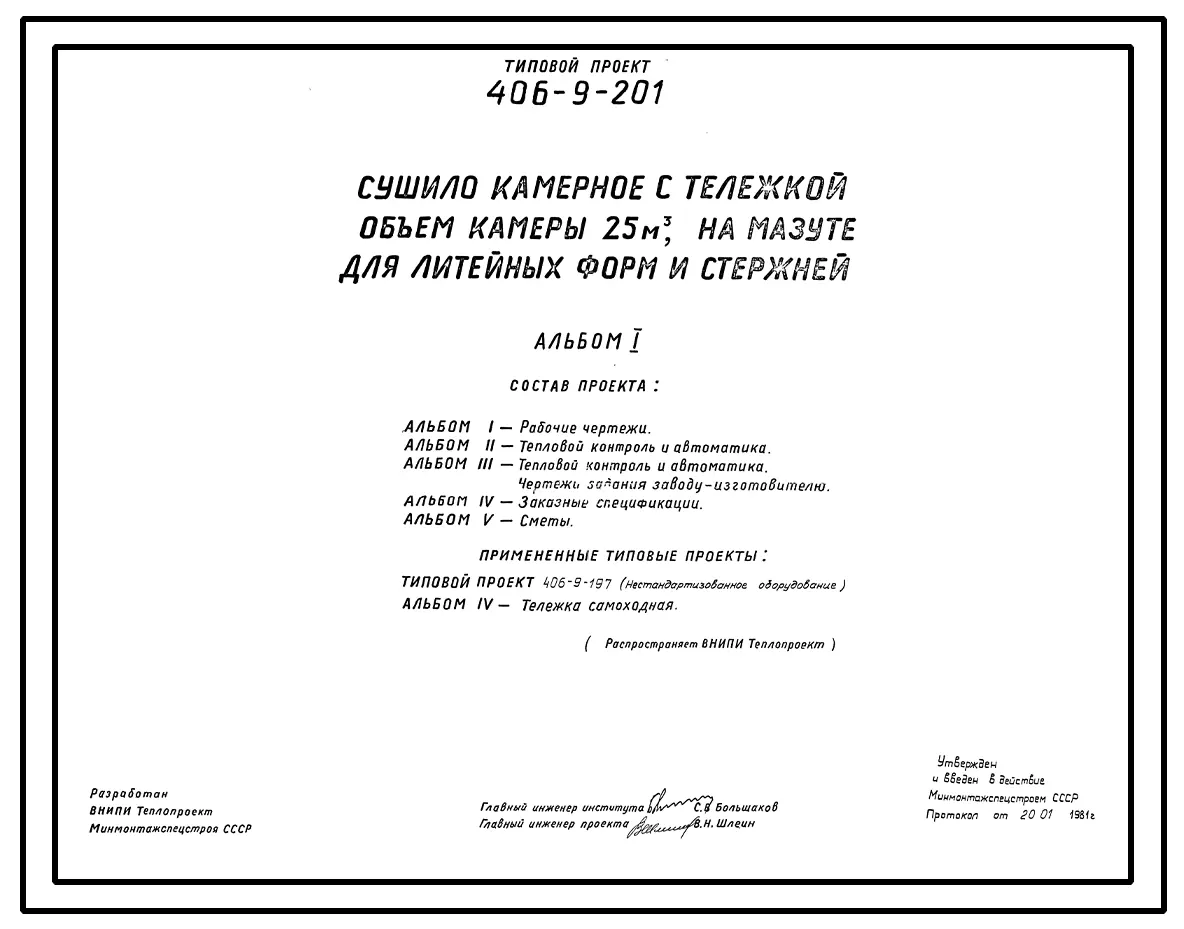 Типовой проект 406-9-201 Сушило камерное с тележкой, объем камеры 25 м3, на мазуте для литейных форм и стержней